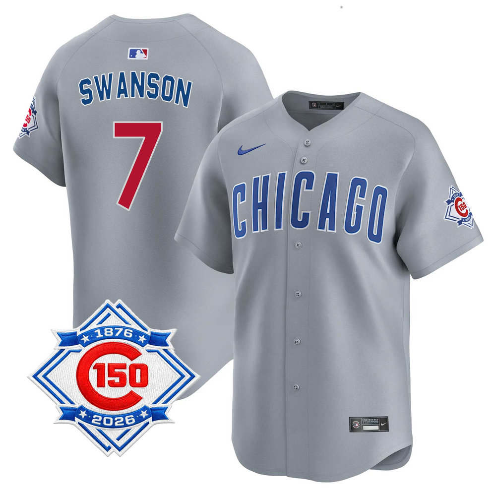 Men's Chicago Cubs #7 Dansby Swanson Grey Nike Road Vapor Limited 150th Anniversary Authentic Lettering Jersey