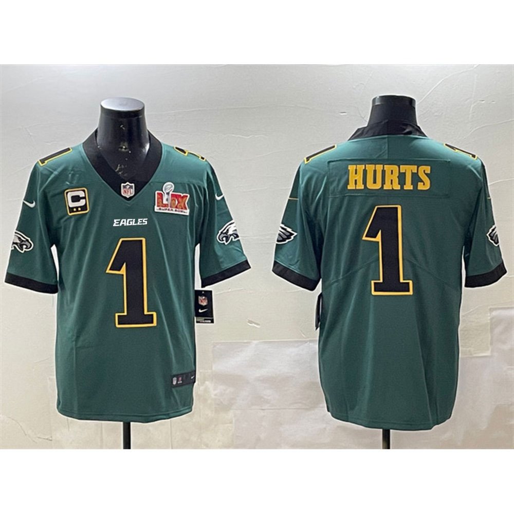 Men's Philadelphia Eagles #1 Jalen Hurts Green Golden 2025 Super Bowl LIX Patch And 2-star C Patch Vapor Untouchable Limited Stitched Football Jersey