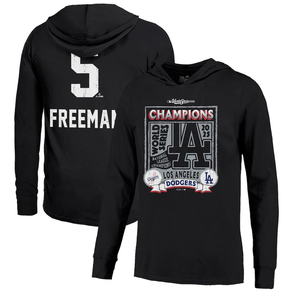 Men's Los Angeles Dodgers #5 Freddie Freeman Threads Black 2025 World Series Champions Name & Number Lightweight Hoodie