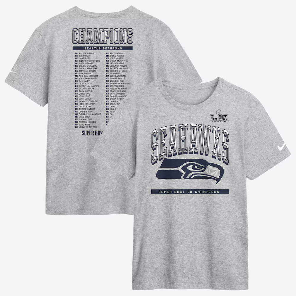 Men's Seattle Seahawks Nike Heather Gray Super Bowl LX Champions Ice Classic Roster T-Shirt